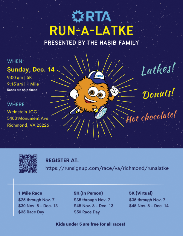 To register, visit https://runsignup.com/Race/VA/Richmond/RunALatke. All profits from the race support education at RTA - Richmond Hebrew Day School.
