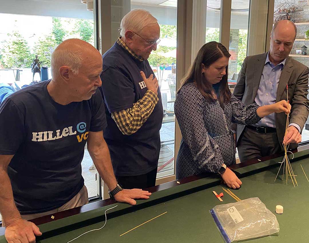 Board Retreat Team Building: Board members compete to build a spaghetti tower while drawing parallels to their work rebuilding the Hillel at VCU. (From left) Steve Biegler, John Jay Schartz, Michal Coffey, Jim Weinberg