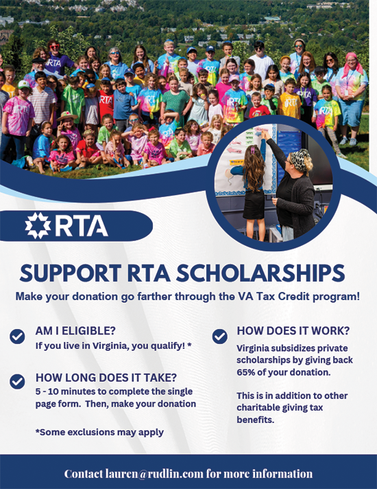 Through the Virginia Tax Credit Program, individuals and businesses can redirect a portion of their state tax liability to help fund scholarships for students who qualify for financial aid. These scholarships open the doors of RTA to families who want their children to benefit from an exceptional Jewish and general studies education but might otherwise find tuition out of reach.