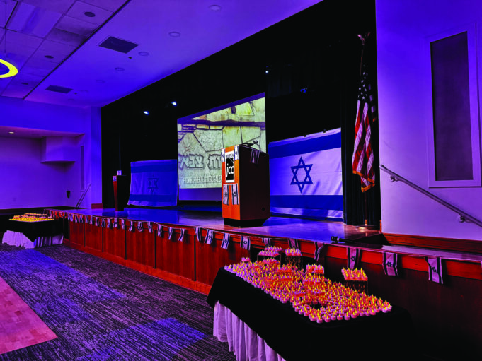 The November Auditorium is set up with the flag of Israel and Memorial Yartzeit candles.