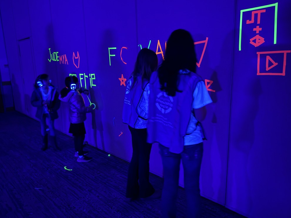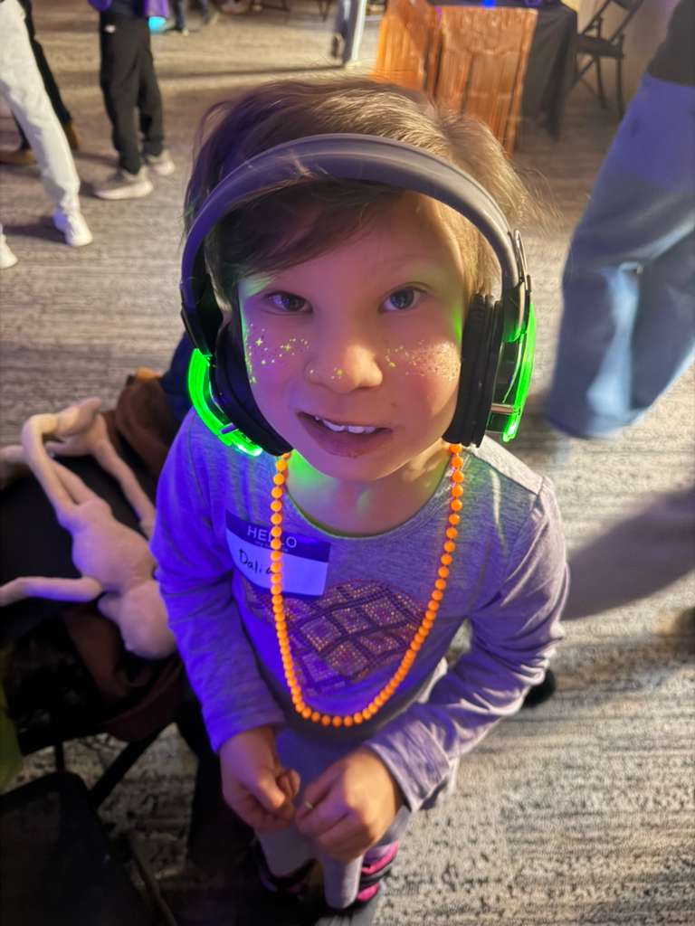 Throughout the afternoon, guests enjoyed three music selections through wireless headphones: kids’ favorites, teen hits, and Jewish/Israeli music, giving everyone the freedom to choose their own soundtrack and volume. Various glow-themed activity stations offered hands-on fun for those who needed a break or preferred a quieter activity. The stations included jewelry making, creative drawing, sensory rice exploration, glow tattoos, and colorful tape art. Each element was designed with accessibility and engagement in mind.