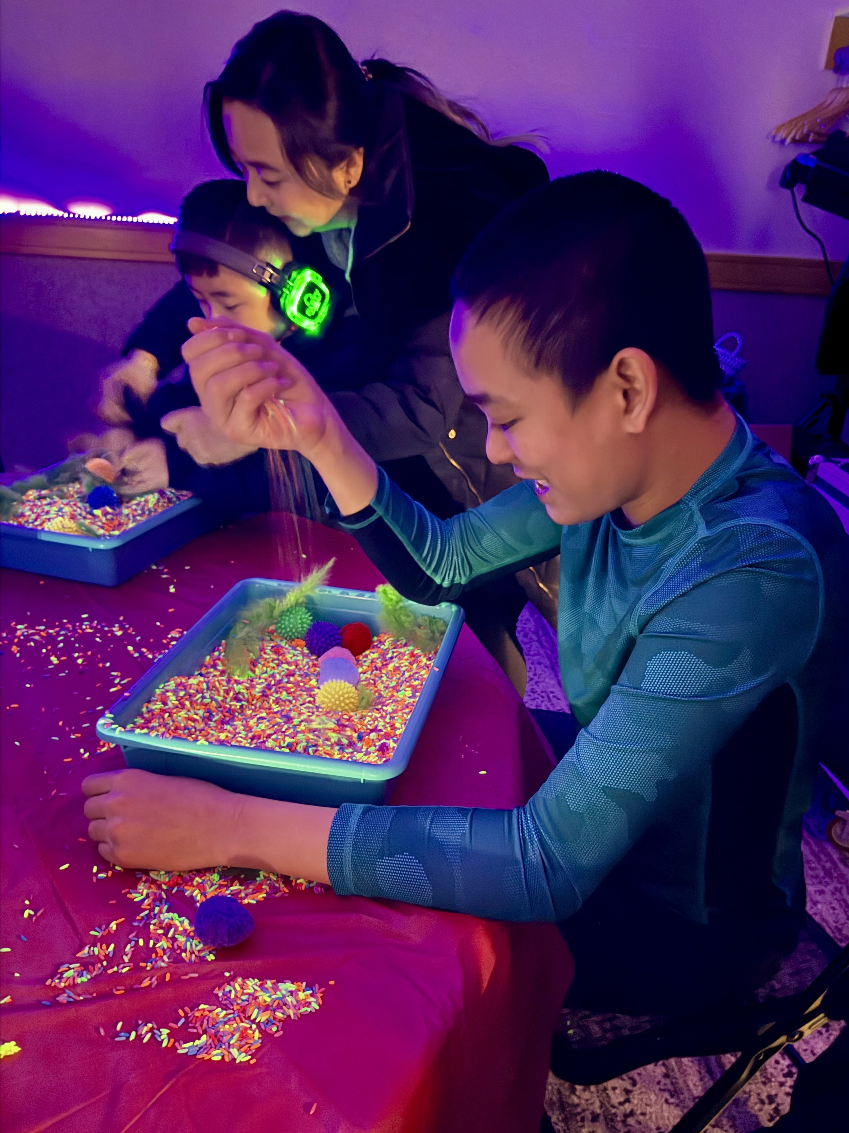 Friends enjoying the sensory glow rice