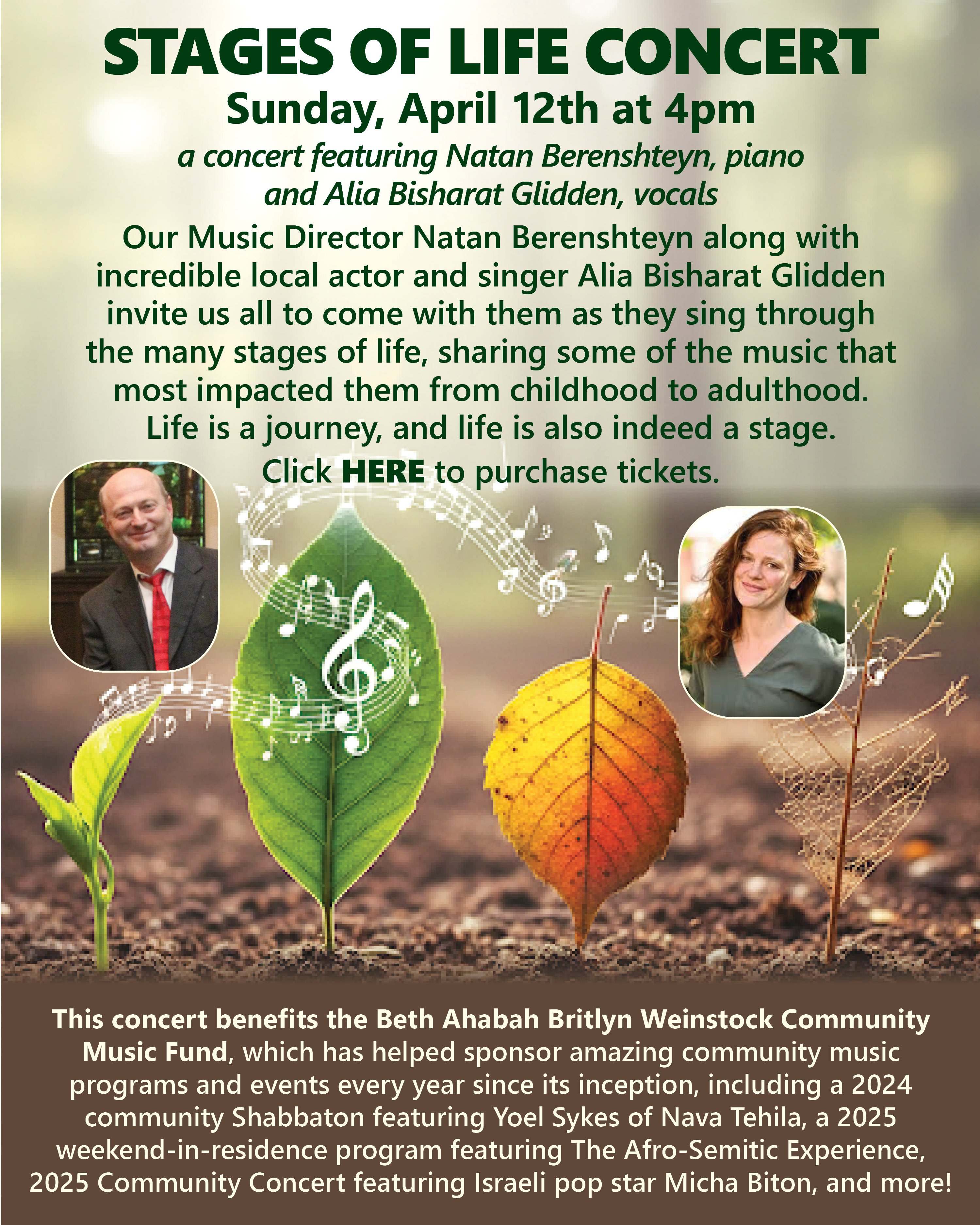 All are invited to a Stages of Life Concert on Sunday April 12th at 4 p.m., featuring Beth Ahabah’s Music Director, Natan Berenshteyn, with incredible local actor and singer, Alia Bisharat Glidden! Come with them as they sing though the many stages of life, sharing some of the music that most impacted them from childhood to adulthood. Life is a journey, and life is also a stage!