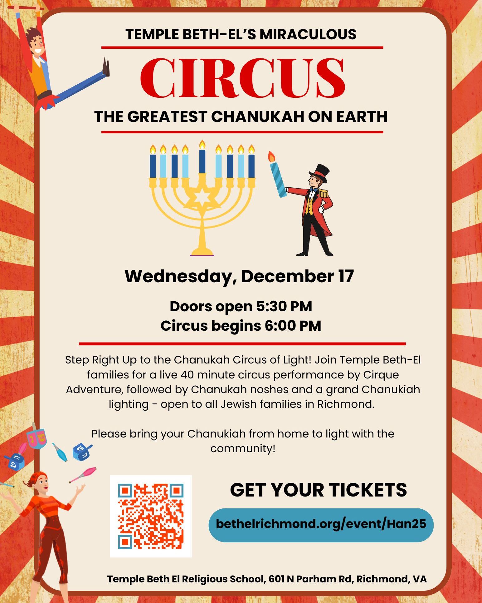 Open to the entire Jewish community, Temple Beth-El's Chanukah circus extravaganza is guaranteed to be an evening of fun and spectacle!