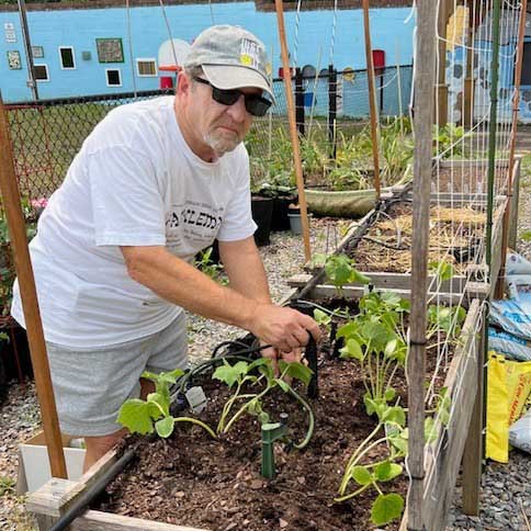 A big thank you to Norm Geller (pictured) for installing the irrigation system and netting for the garden’s growing zucchini and cucumbers.