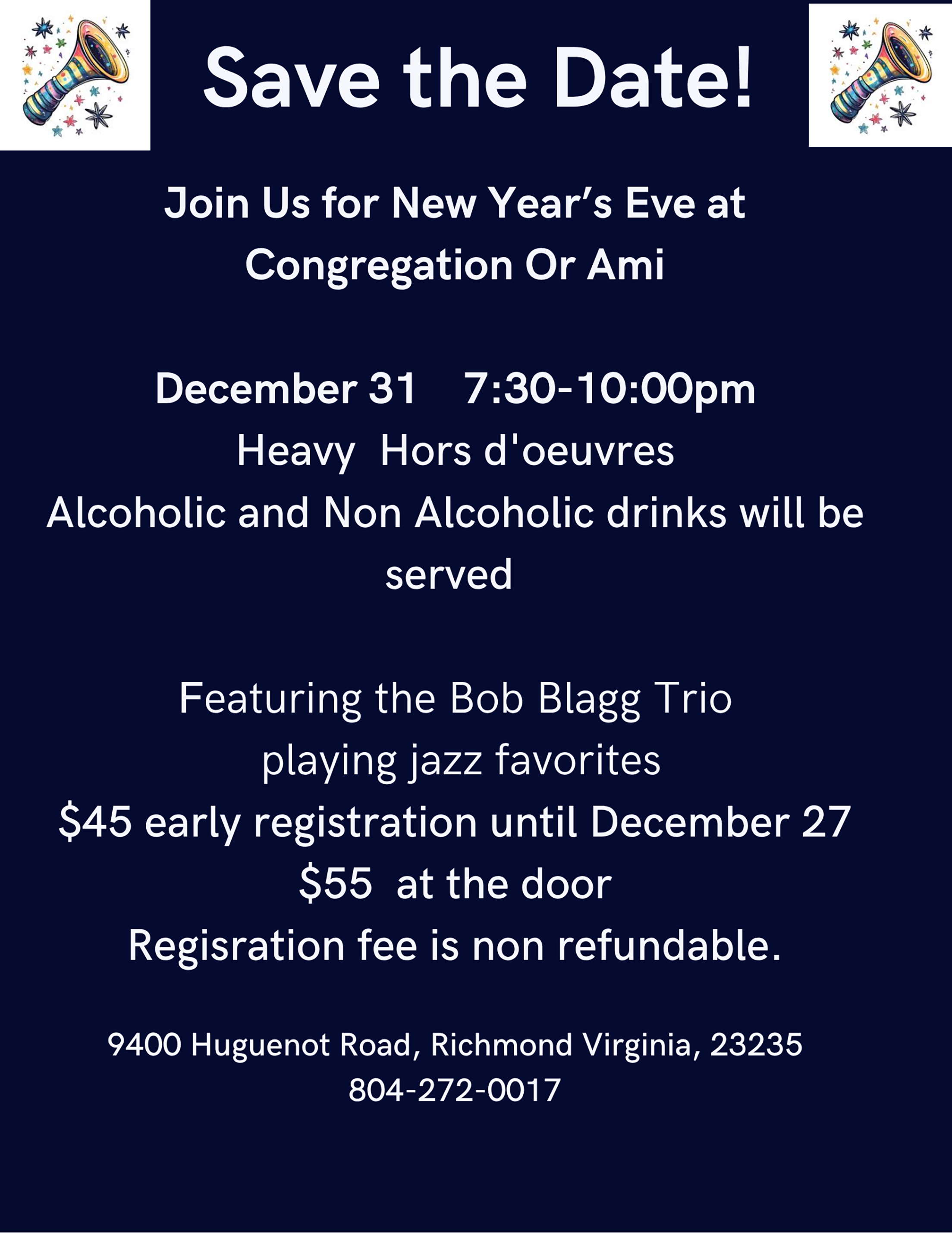Or Ami is again hosting a fun, classy (but not dressy) New Year's Eve celebration. All are invited to enjoy music, heavy hors d'oeuvres, and fellowship. More information and an Eventbrite link will be in the December edition.